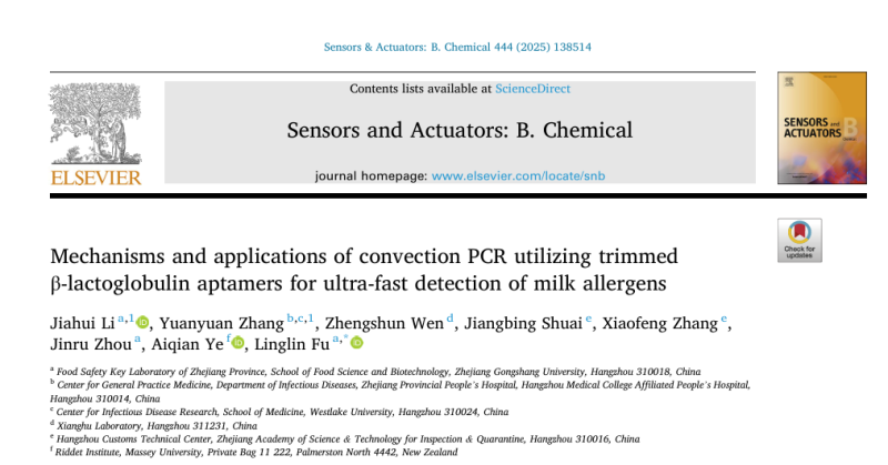 2025 年 11 月,分析化学与仪器交叉学科领域的期刊《Sensors and Actuators: B. Chemical》(影响因子7.7,一区TOP期刊,为我校A+++级期刊),刊载了题为 “Mechanisms and applications of convection PCR utilizing trimmed β-lactoglobulin aptamers for ultra-fast detection of milk allergens” 的研究论文。论文通讯作者为我校食品与生物工程学院傅玲琳教授,2025级博士研究生李稼晖为本文第一作者,我校食品与生物工程学院为第一和唯一通讯单位。