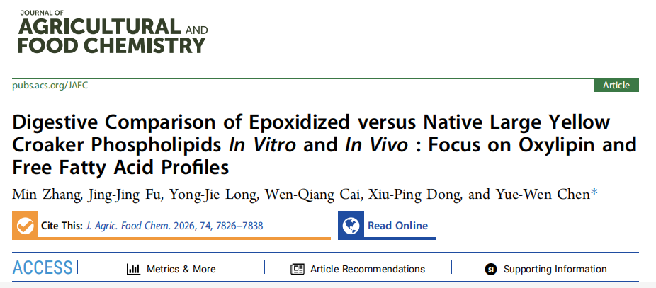 近期,浙江工商大学食品学院陈跃文教授在《Journal of Agriculture and Food Chemistry》(中科院一区)上发表封面文章,题为“Digestive Comparison of Epoxidized versus Native Large Yellow Croaker Phospholipids In Vitro and In Vivo: Focus on Oxylipin and Free Fatty Acid Profiles”。大连工业大学食品学院2022级博士研究生张敏为第一作者,陈跃文教授为论文通讯作者。