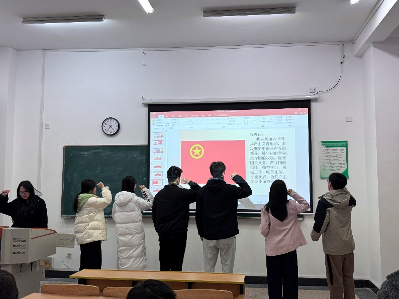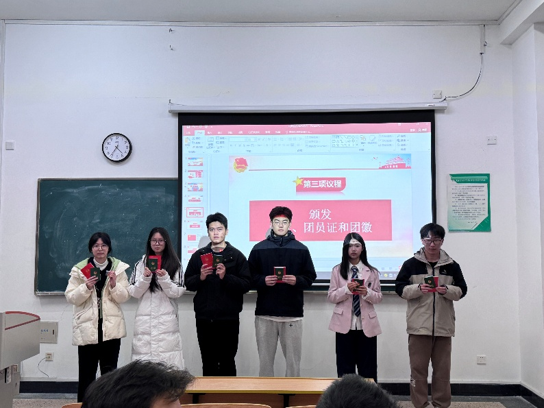 在主持人宣读新团员名单后,全场响起热烈的掌声表达对新团员的欢迎和真挚的祝贺。团副陈小娅为新团员颁发团章、团员证和团徽。新团员在团副郑昕桐的带领下面向团旗立正,右手握拳,举过右肩,在中国共青团团旗下庄严宣誓:“我志愿加入中国共产主义青年团,坚决拥护中国共产党的领导,遵守团的章程,执行团的决议,履行团员义务,严守团的纪律,勤奋学习,积极工作,吃苦在前,享受在后,为共产主义事业而奋斗!”每一位新团员的宣誓词都饱含激情,每一句誓言都包含着担当和责任,表达了他们对团组织的忠诚与向往。