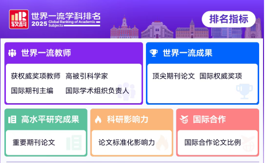 作为覆盖全球 3000 余所高校的权威排名,软科世界一流学科排名采用五个模块九项国际可比的客观学术指标,衡量全球大学在各个学科的学术竞争力。指标体系见下图。