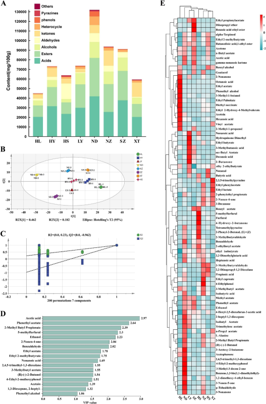 图1.基于HS-SPME-GC–MS测得的各类挥发性化合物(VCs)含量(A)。全部样品的OPLS-DA得分图(B)。200次置换检验的交叉验证图(R2 = 0.23,Q2 = -0.962)(C)。HS-SPME-GC–MS鉴定出的VIP得分 > 1的VCs(D)。HS-SPME-GC–MS测得VCs的热图分析(E)。