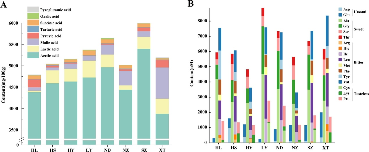 图3.不同来源的ZRV中有机酸(A)和氨基酸(B)的含量。