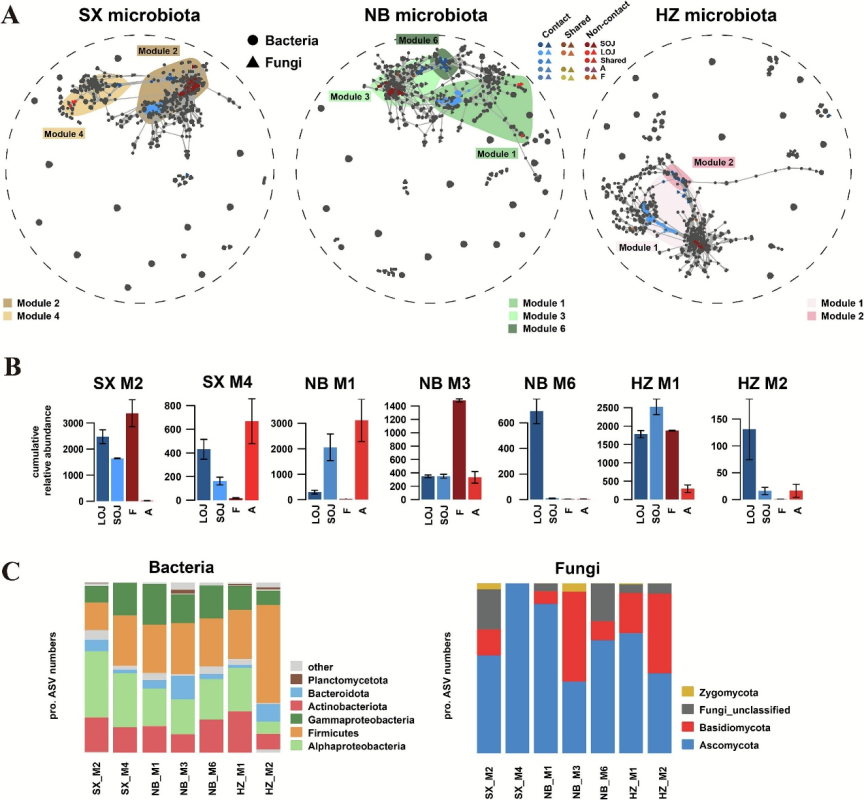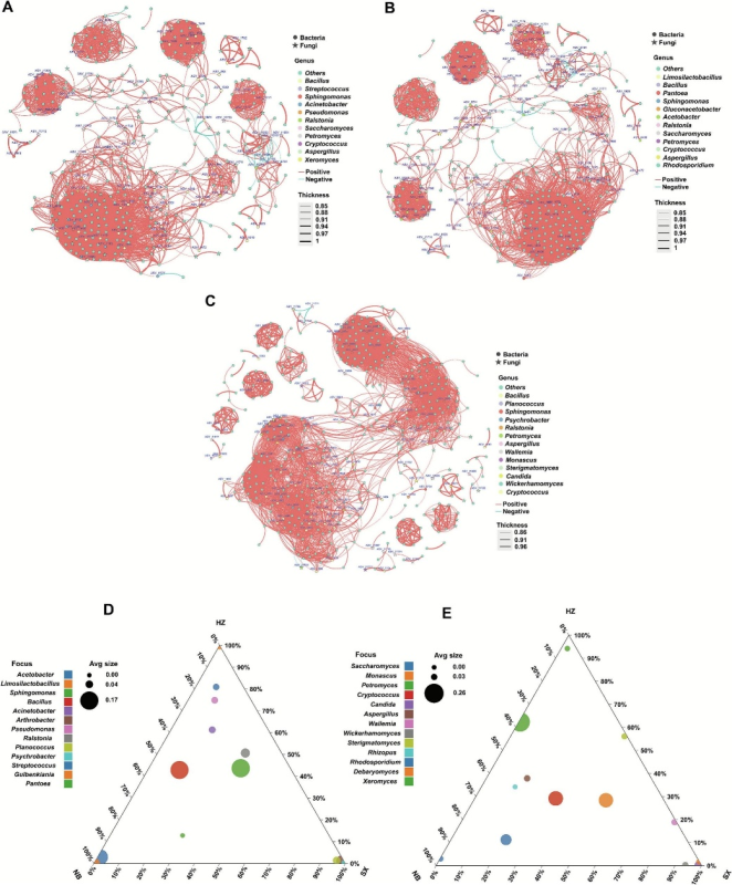 图2.三家醋厂环境样本中微生物群落的共生网络分析。