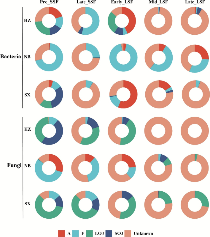 图3. 在醋发酵的每个阶段,不同环境来源的微生物对(A)细菌和(B)真菌群落的相对贡献。