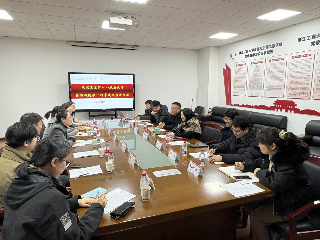 为深化食品学科领域校际合作,凝聚学科建设共识,共谋“十五五”期间学科发展新蓝图,2026年1月27日上午,浙江工商大学食品与生物工程学院与黑龙江八一农垦大学食品学院(北大荒农产品加工现代产业学院)交流座谈会在下沙校区贝因美楼224会议室顺利举行。会议由浙江工商大学食品与生物工程学院院长傅玲琳主持,院党委书记张东、副院长田师一、各系室负责人及教师代表齐聚一堂,展开深入研讨与交流。